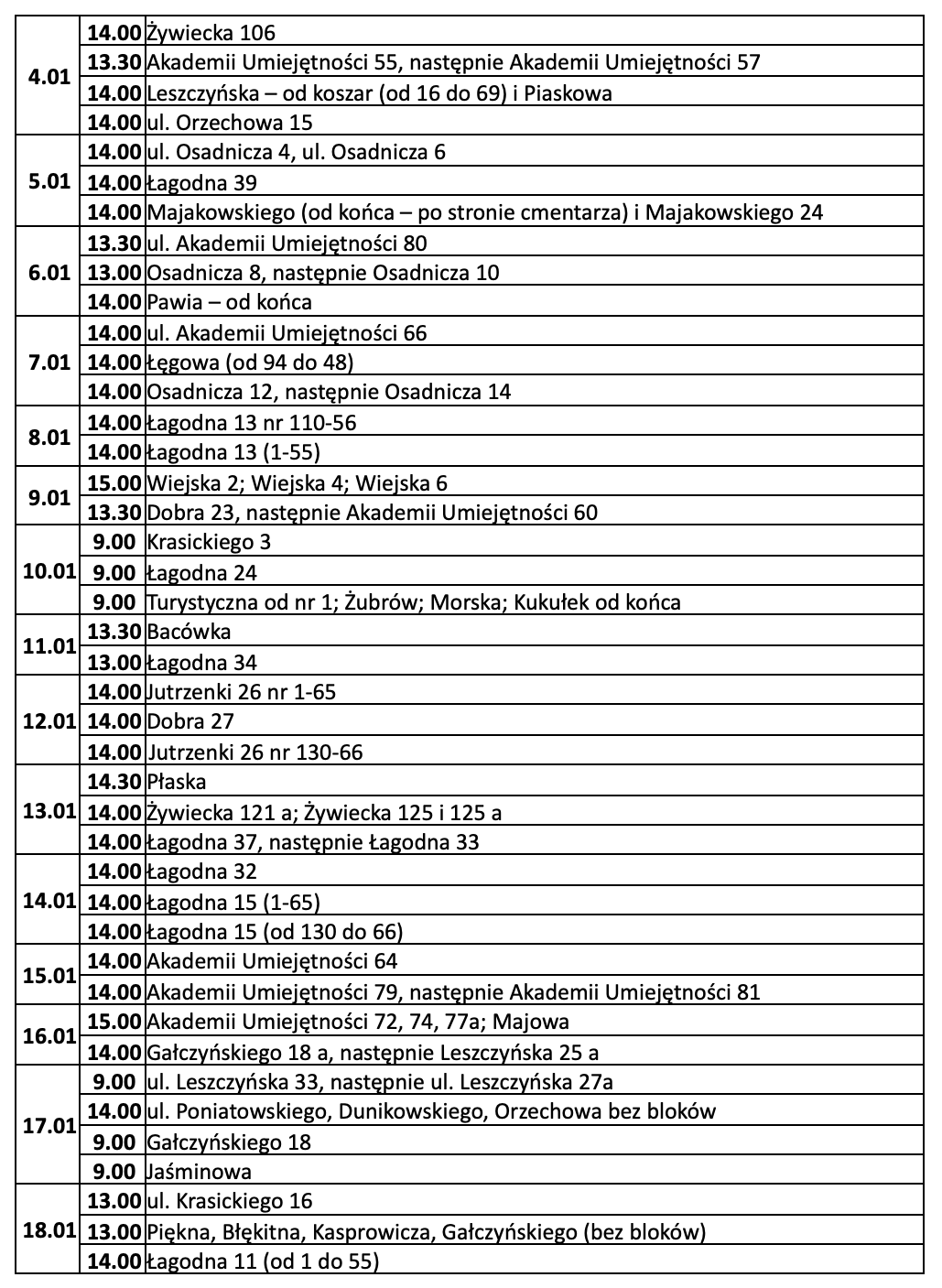 Plan kolędy – 4/01-18/01