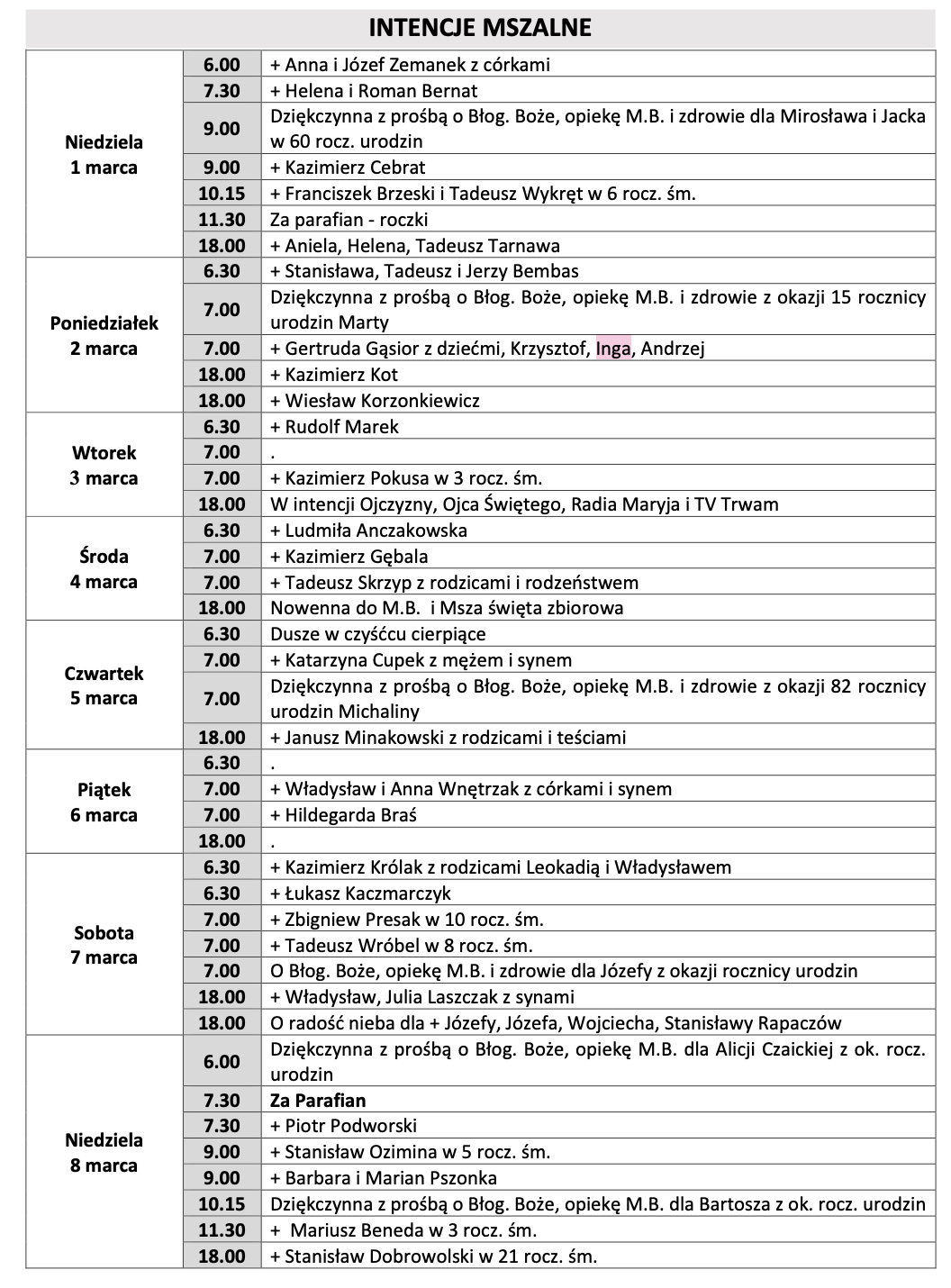 • Intencje mszalne